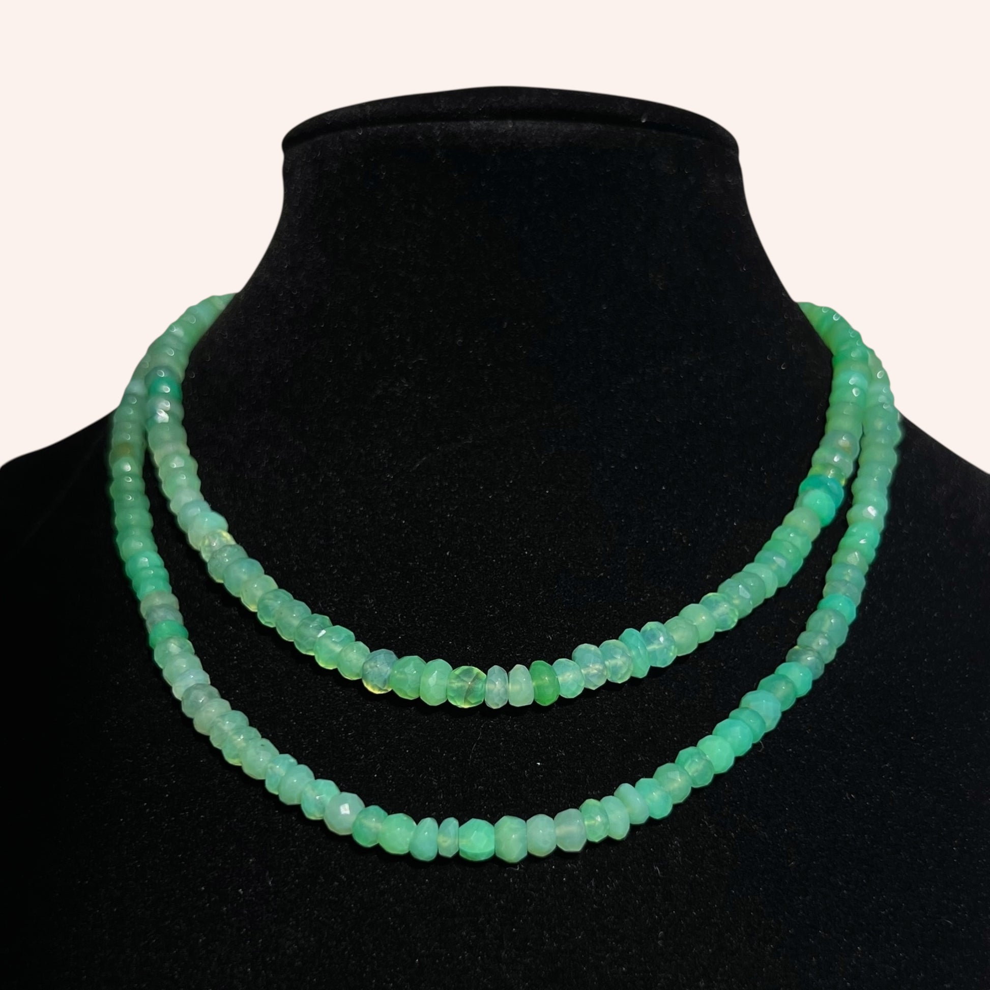 Chrysoprase is known as a stone of joy and abundance, believed to open the heart to compassion, optimism, and new opportunities. Whether worn for its uplifting energy or its striking green glow, this necklace brings a touch of natural radiance to any outfit.