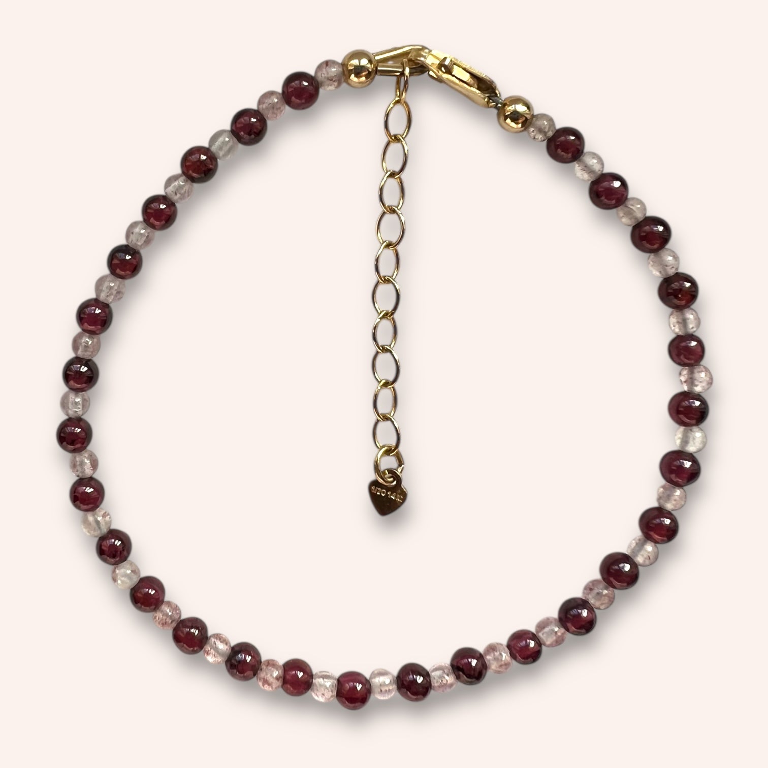 This Bracelet's name alludes to both the traveler's protection of garnet and the inner exploration of clear quartz.