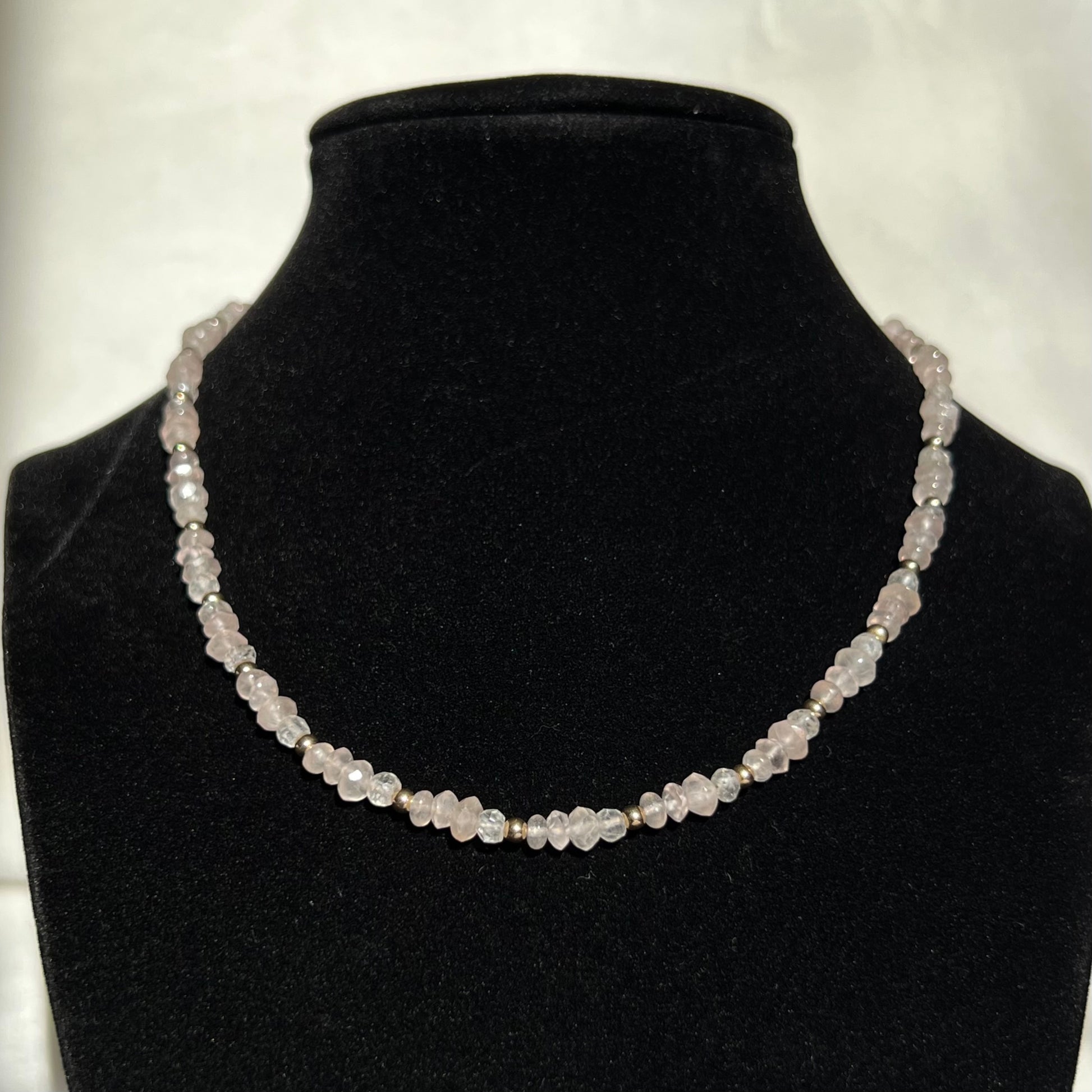 The Blush Whisper Choker is a tender, feminine piece crafted from natural 3–5mm Rose Quartz in softly shifting shapes and tones. Its gentle pink hues are accented with subtle 14k gold-filled spacers, adding a warm shimmer without taking away from the stone’s dreamy, romantic glow.