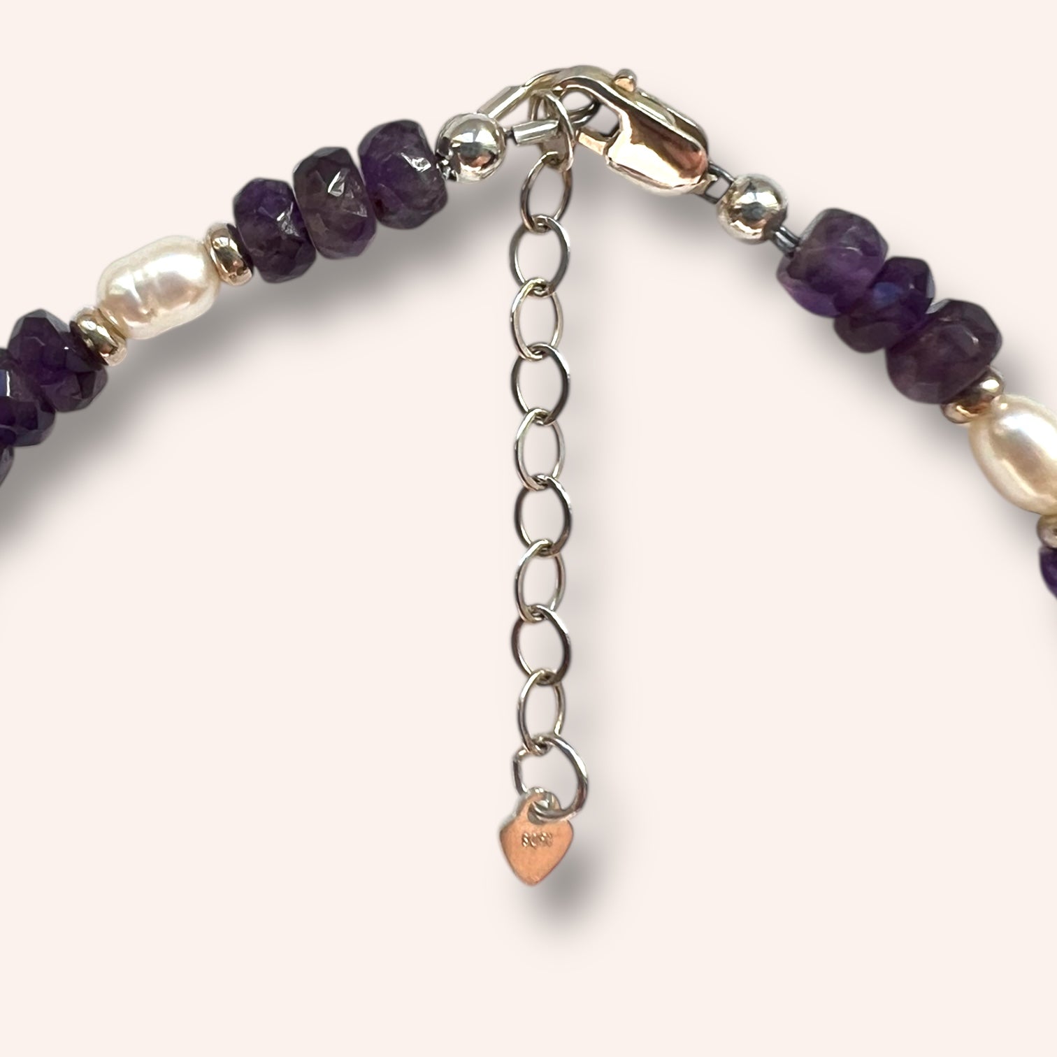 Elegant, feminine, and effortlessly timeless, Moonlit Amethyst brings together the soothing depth of 5mm faceted Amethyst beads with the gentle luminosity of freshwater pearls. The combination of deep violet and soft pearl sheen creates a harmonious contrast — grounded yet ethereal, bold yet classic.