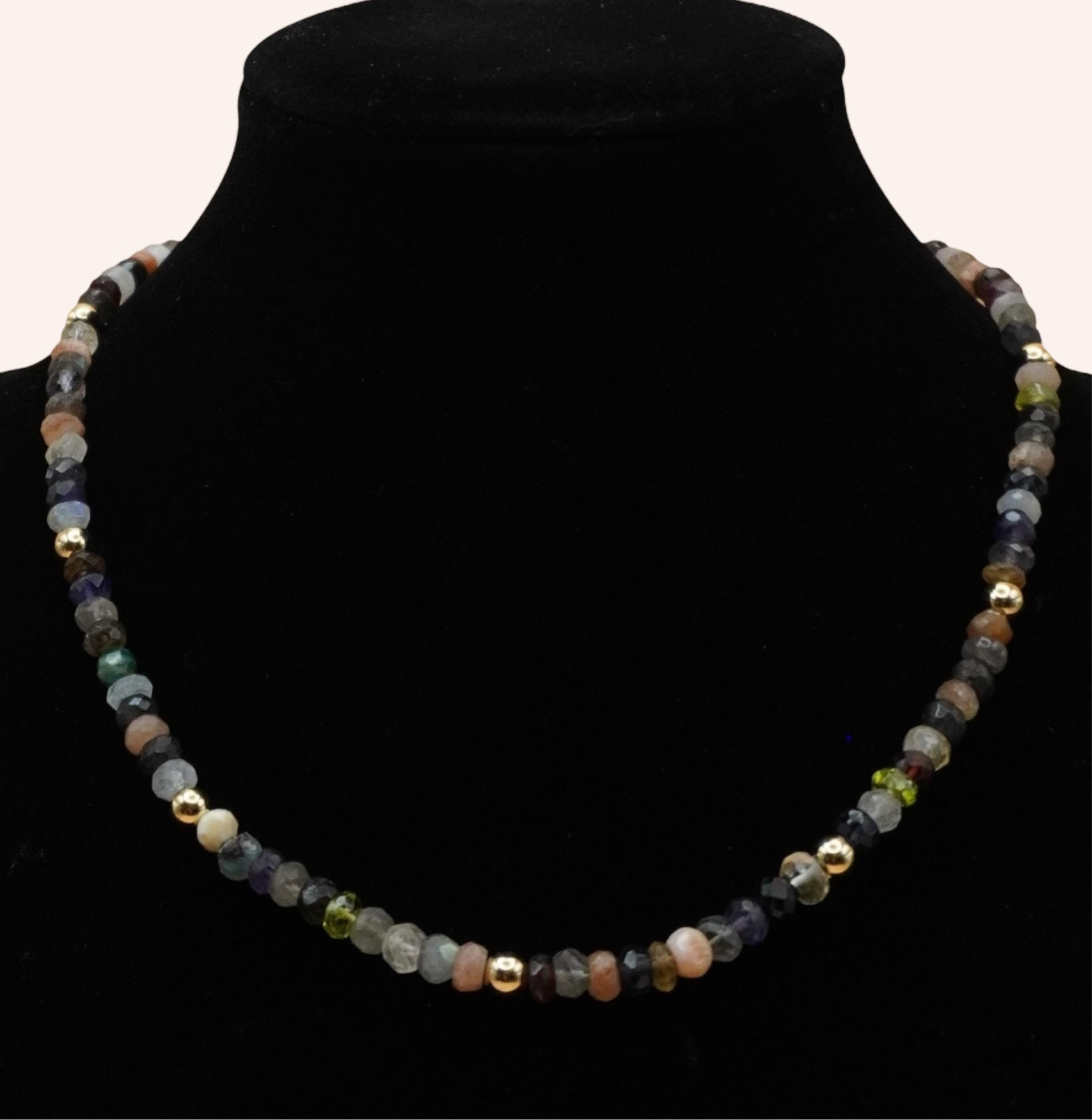 This elegant design features a hand-selected mix of faceted gemstones—including iolite, garnet, peridot, labradorite, sunstone, and more—accented with 14k gold-filled beads for a touch of warmth and luxury. Each stone carries its own energy: garnet for grounding, iolite for inner vision, peridot for renewal, sunstone for joy, and labradorite for protection.