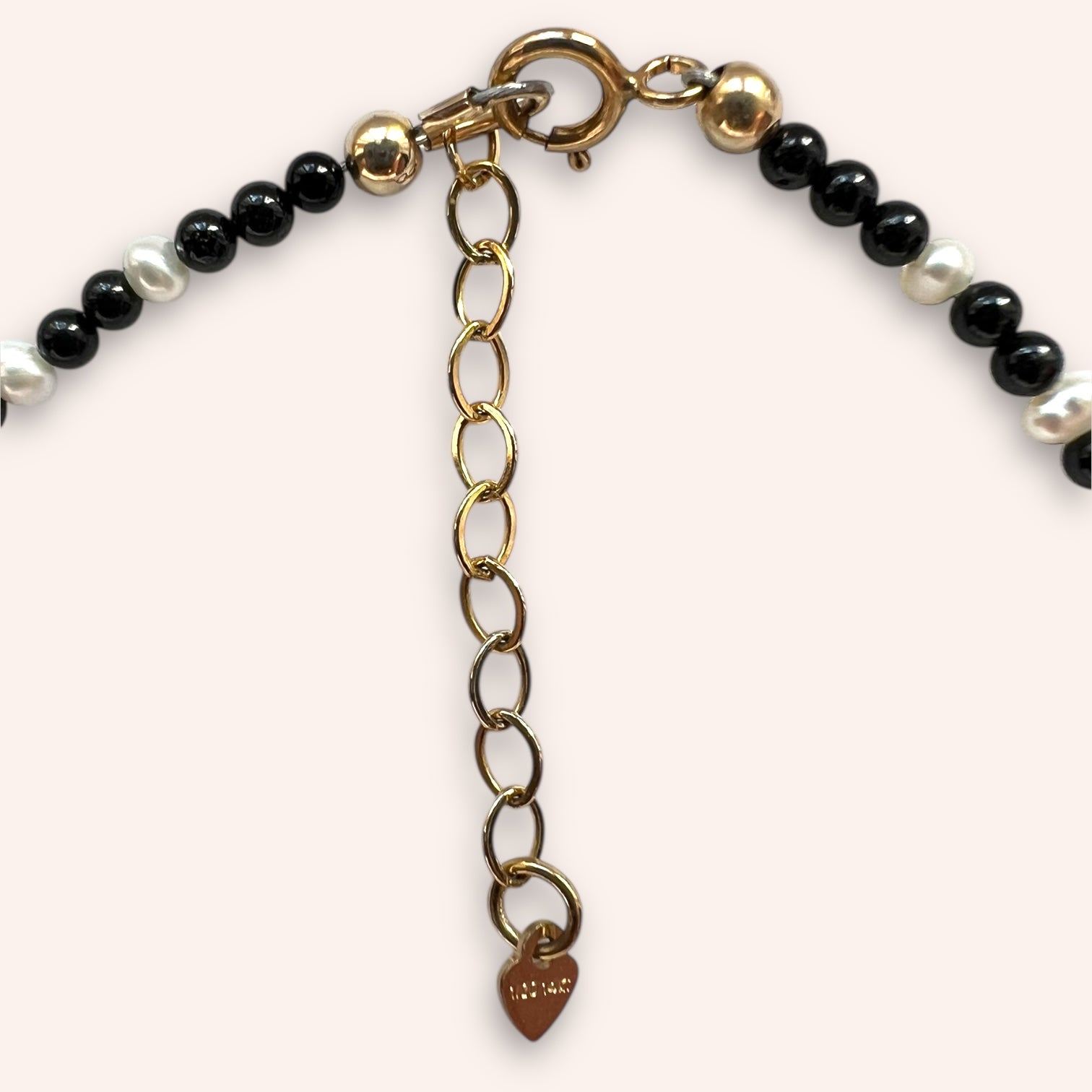 Warm 14k gold-filled accents enhance the contrast beautifully, adding a soft golden glow that ties the design together. Handcrafted at 16 cm with a 3 cm gold-filled extension chain, this piece offers an adjustable, comfortable fit perfect for stacking or wearing alone as a minimal yet powerful statement.