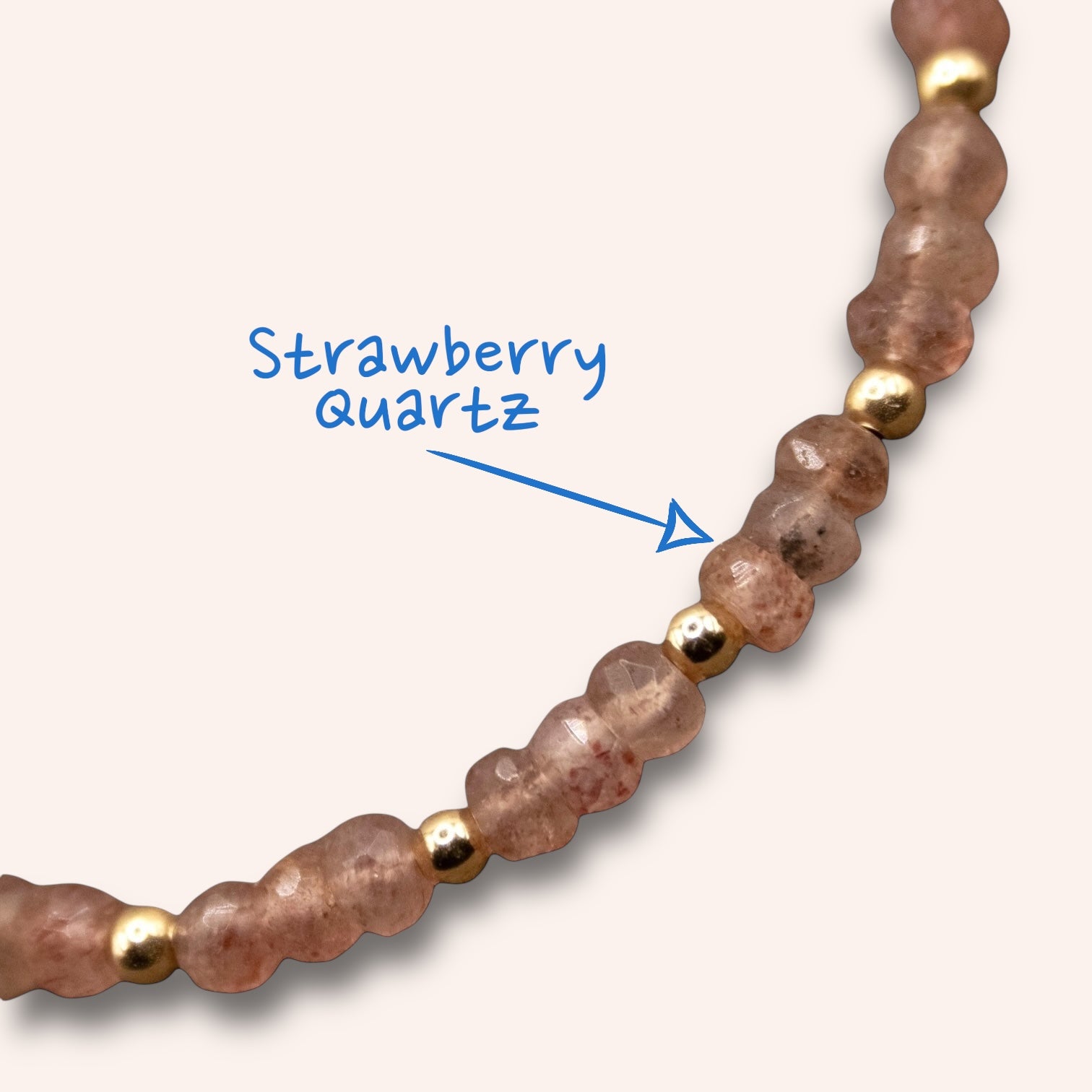 Soft and romantic, the Summer Love Bracelet combines the gentle blush tones of Strawberry Quartz with warm 14k gold filled accents, creating a piece that radiates love and positivity.