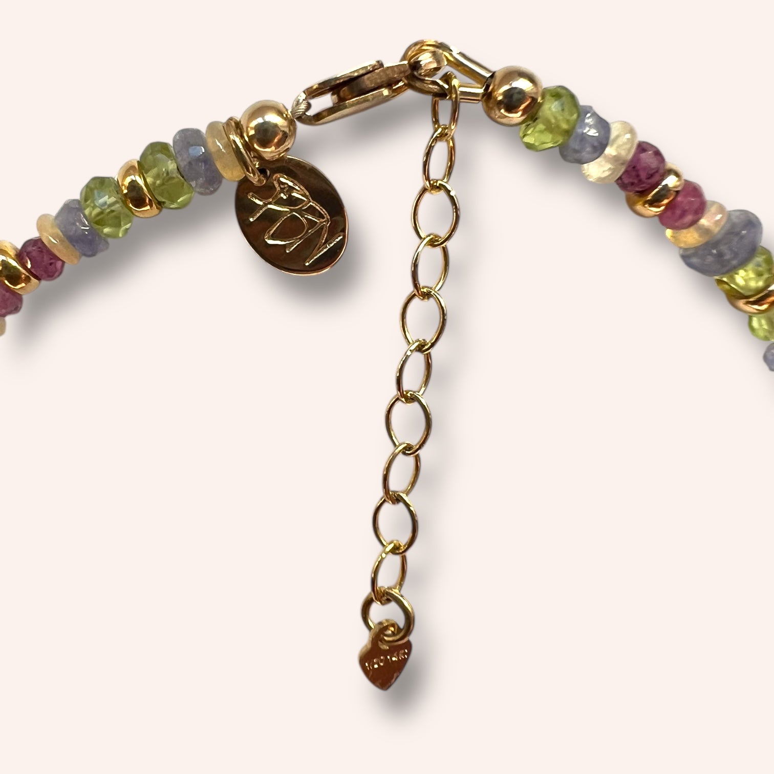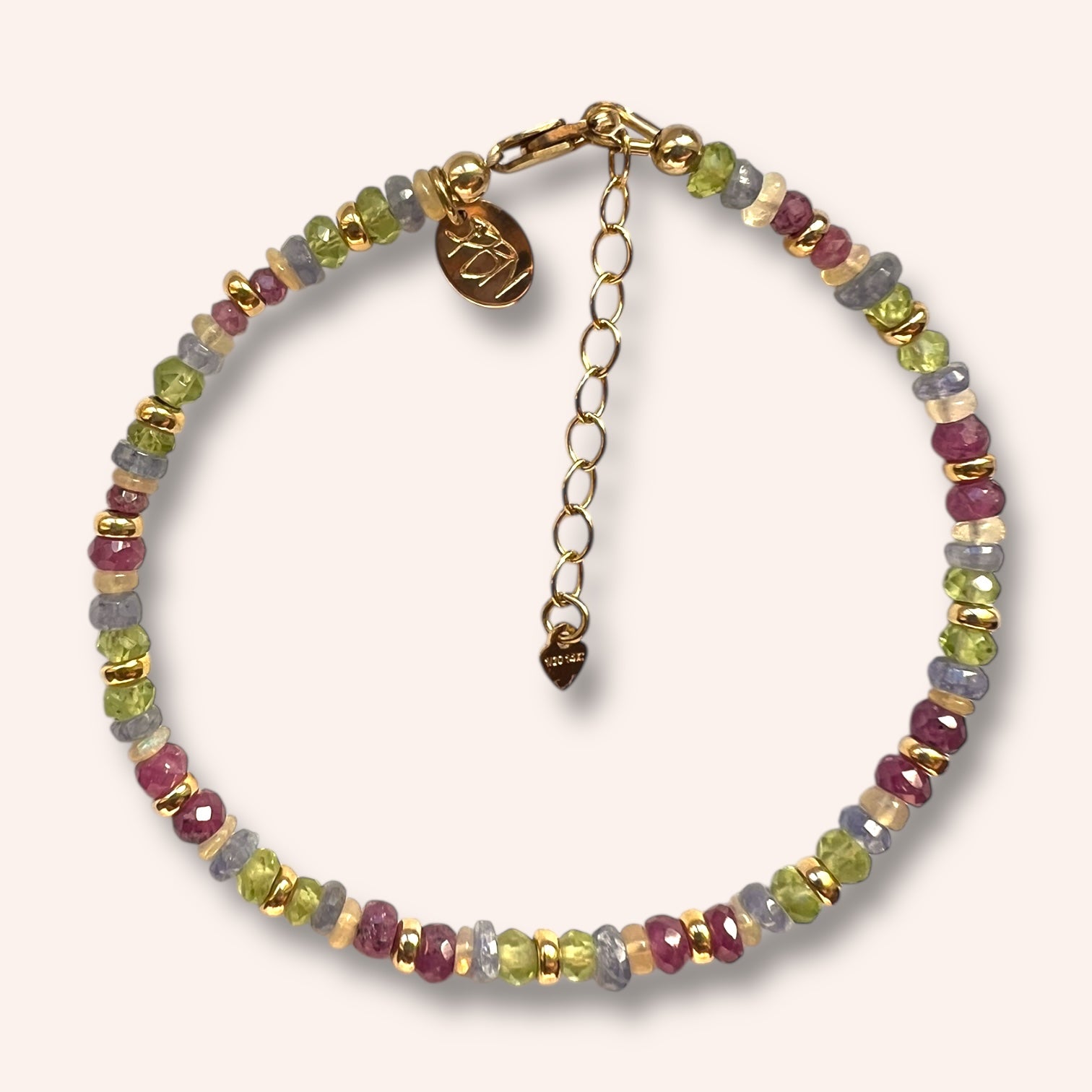 Vibrant, elegant, and full of joyful harmony, Spectrum of Serenity weaves together five radiant gemstones — Peridot, Ruby, Tanzanite, Ethiopian Opal, and Sapphire — in a colorful, balanced design. Each 3mm faceted bead adds its own unique glow, while smooth 14k gold-filled spacers bring warmth, cohesion, and a luxurious finish.