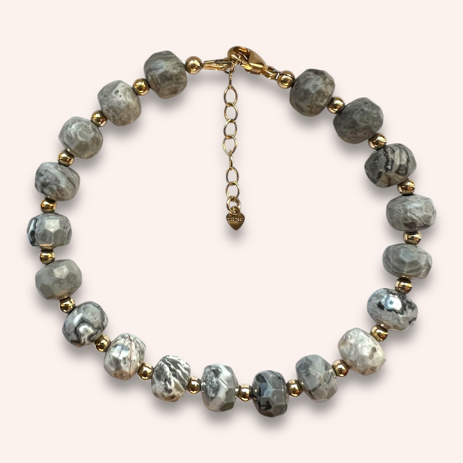 Modern, artistic, and full of natural expression, Stone Canvas features striking 8mm Picasso Jasper beads, each one marked with unique gray, white, and charcoal patterns that resemble brushstrokes on stone. The faceted finish adds gentle sparkle, while the marbled designs make every bead one-of-a-kind — like a tiny abstract painting.