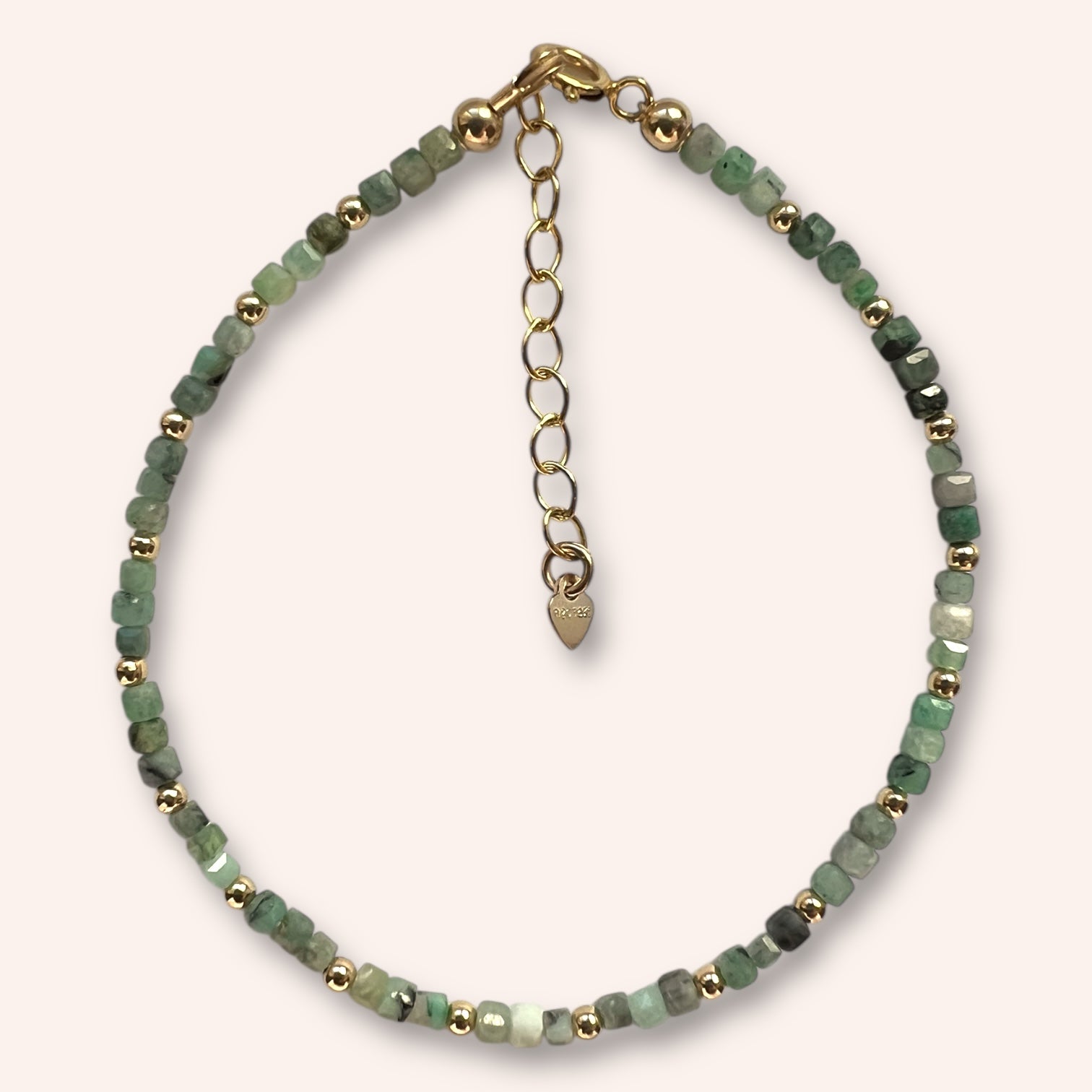 Light, elegant, and full of natural charm, Verdant Whisper celebrates the soft, earthy beauty of genuine emerald. Each bead is a tiny 2mm raw-cut cube, showcasing organic shades of sage, mint, and deep forest green. Paired with luminous 14k gold-filled accents, this bracelet brings effortless refinement to any look.